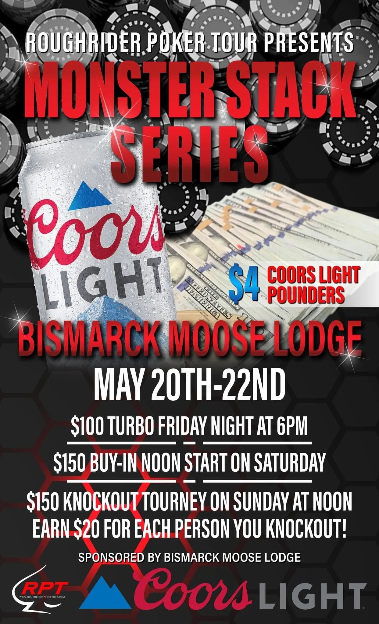Back to All Events Roughrider Poker Tour “Monster Stack Series” Friday, May 20, 2022 6:00 PM Sunday, May 22, 2022 10:00 PM Bismarck Moose Lodge #302 312 North 20th Street Bismarck, ND, 58501 United States (map) Google Calendar ICS $4 Pounders all day! For more info please visit https://www.roughriderpokertour.com